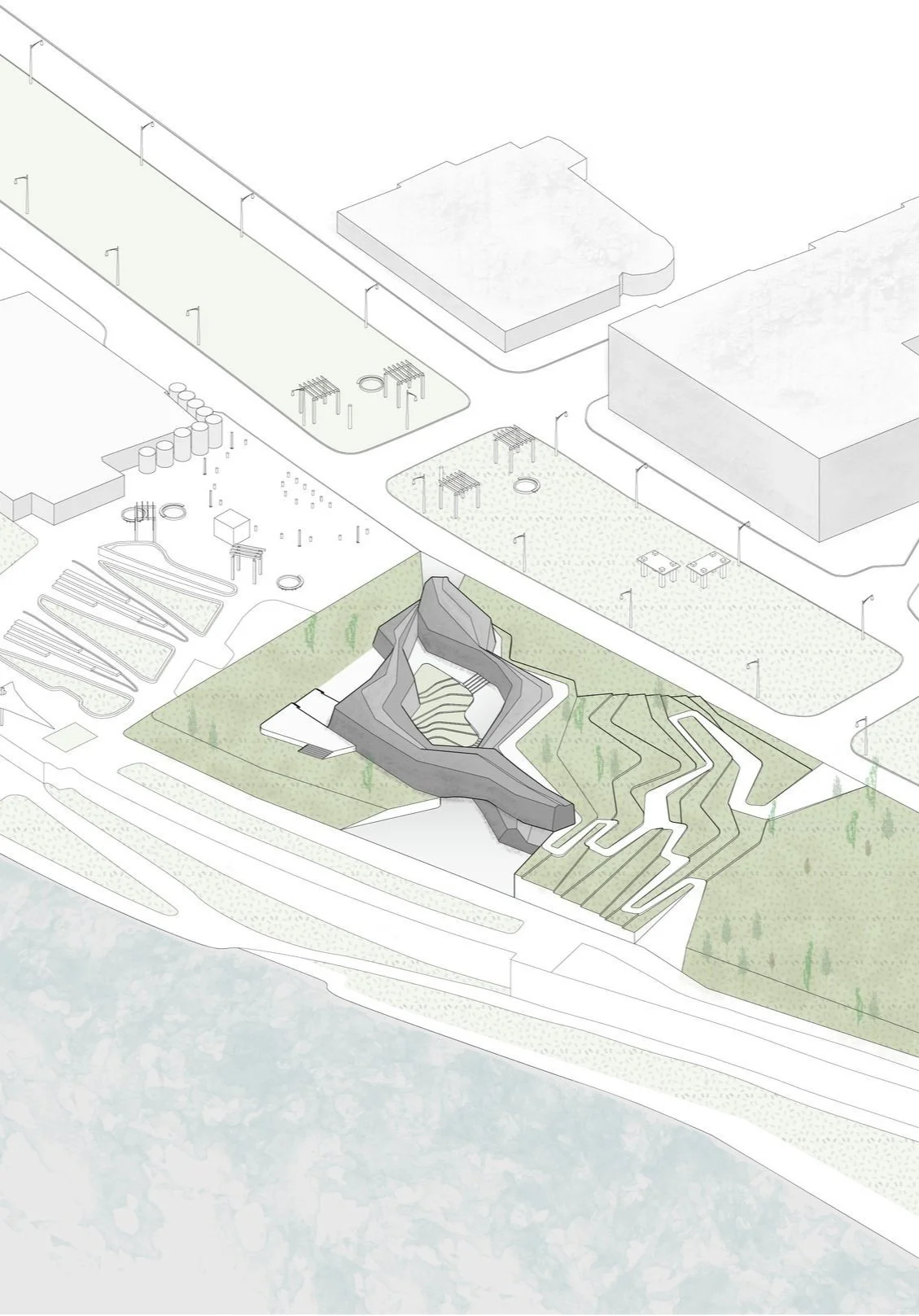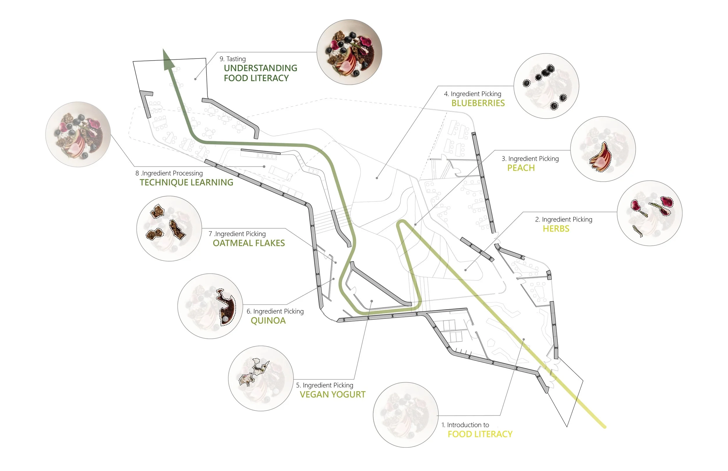 The whole process of a visitor coming to dine in the restaurant is unconventional: it is a hands on learning experience about food literacy where visitors walk through the whole process from picking out fresh ingredients to prepping a finished dish. First, the visitor would enter through the HUB or cultural center, where they learn the idea of food literacy, then they would walk through the garden and storage to pick out fresh ingredients and dry ingredients. Afterwards they would prepare these ingredients with the guidance of sous chefs in the working kitchen. Finally leading to the tasting of their self made dish as well as other chef prepared meals in the restaurant.