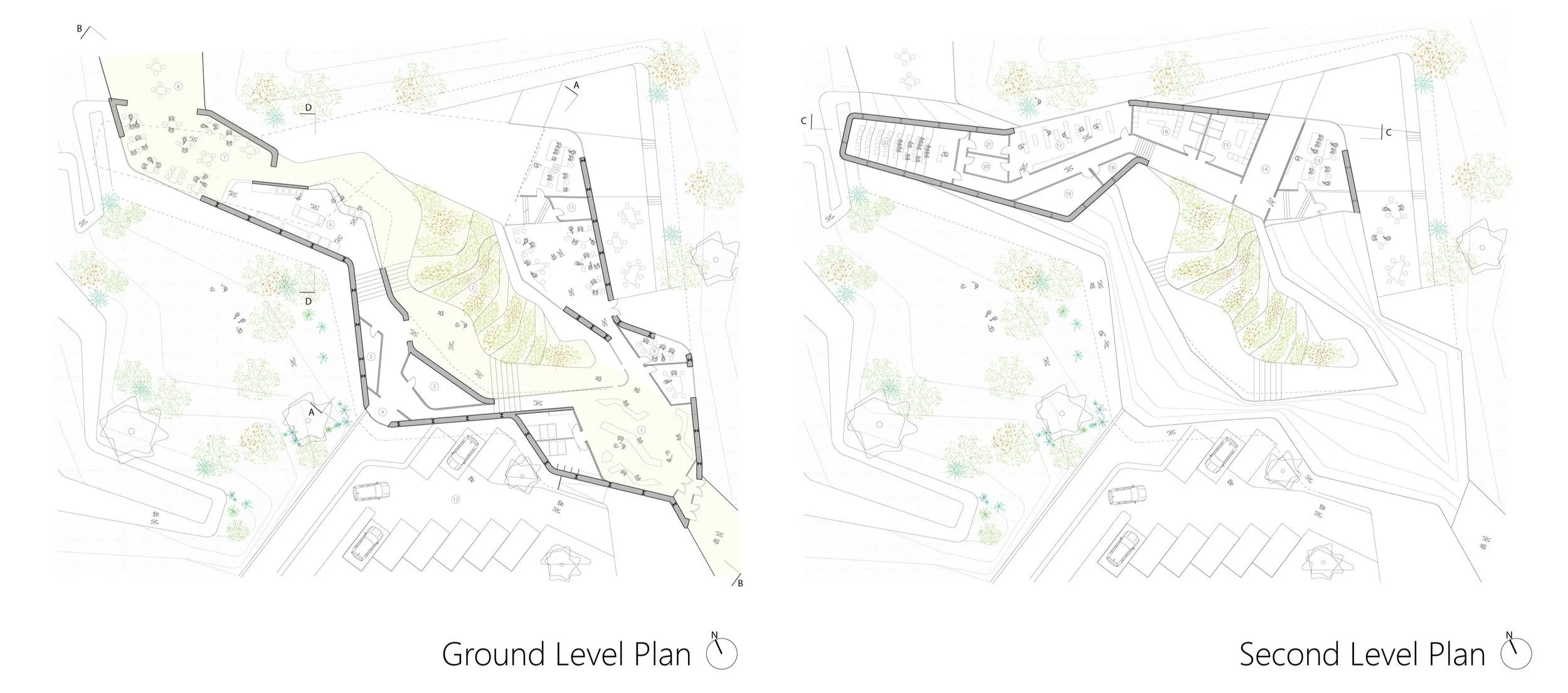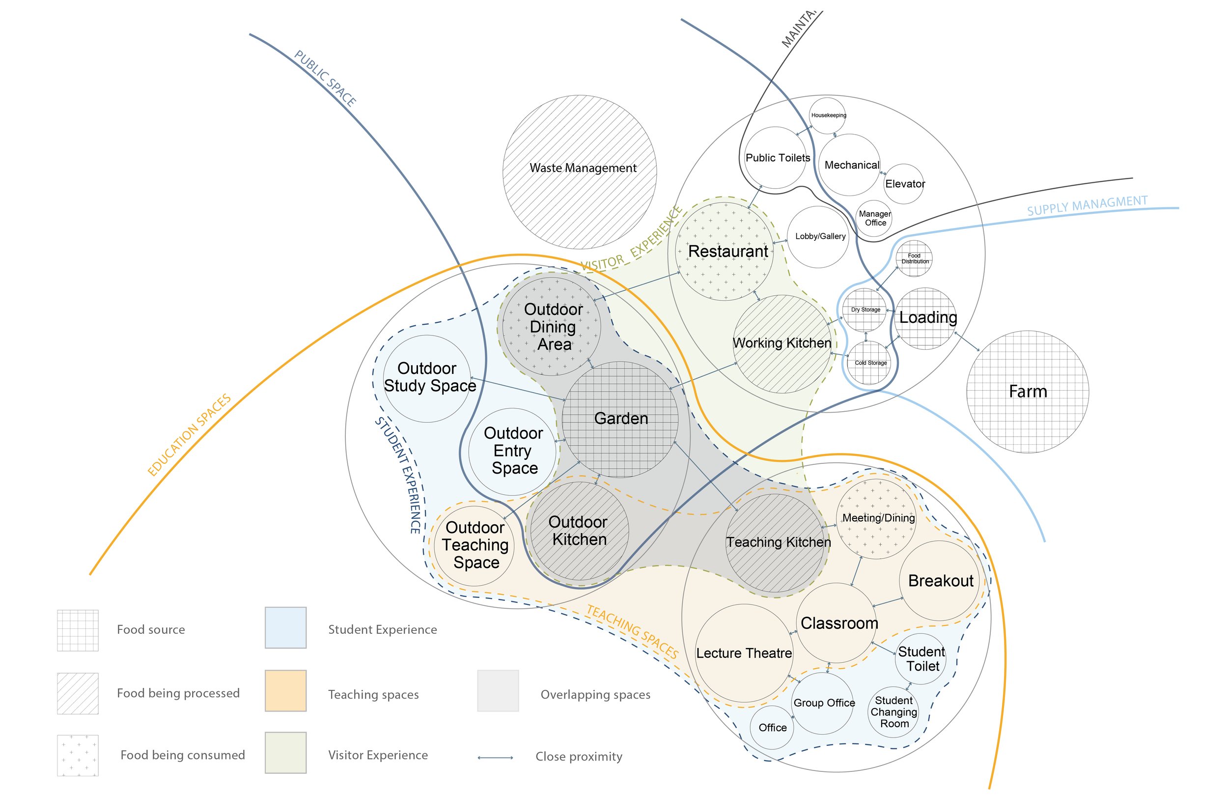 To elaborate the idea of food literacy and translate it into spatial qualities, the project first analyzed the given program and separated them into groups such as private vs public, students vs visitors, indoors and outdoors, which allows for the generation of the grouping of spaces where some overlaps another, which creates a sense of adjacency and was really helpful in our initial design stage. One important takeaway was the importance of an intersectional quality between the teaching and working kitchen, while having close proximity to the garden.