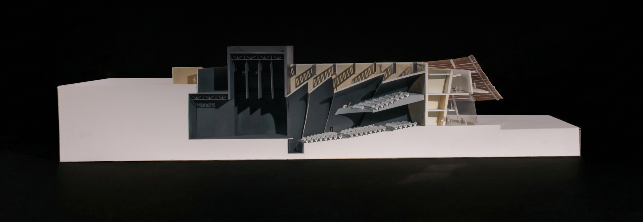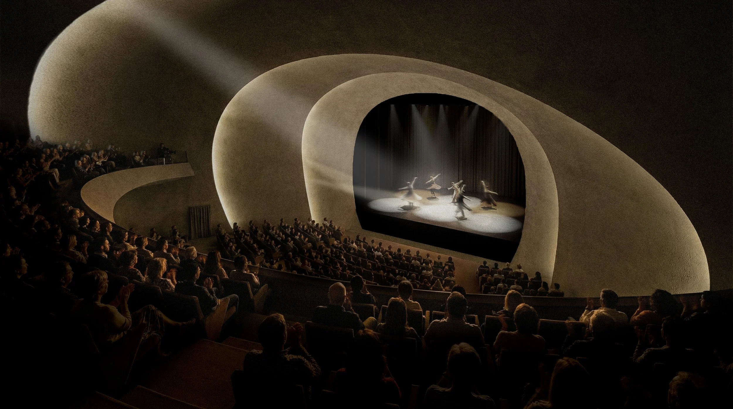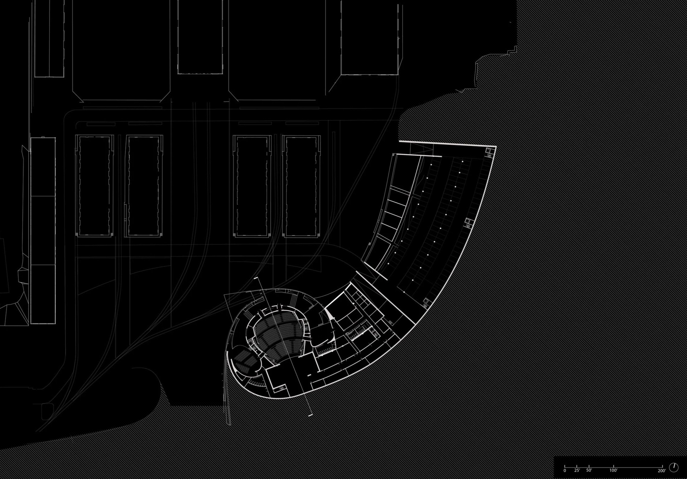 The house is a 1,000-seat theater with 700 seats at the orchestra level and 300 in the balcony, supported by a fly loft and orchestra pit that allow flexibility for dance, opera, drama, and music. While the overall building reads the curve vertically to choreograph circulation, the morphology of the theater rotates this logic ninety degrees, forming a sequence of portals that compress and release before opening toward the performance. Within the chamber, the seating steps and sweeps in a continuous curve, tightening sightlines and creating a shared focus that draws the audience toward the stage. The curved geometry enhances acoustic performance and intimacy, allowing the room to feel both collective and close. Flexible stage infrastructure and the orchestra pit enable multiple configurations, supporting a range of performance types while maintaining a cohesive spatial experience for both performers and audience