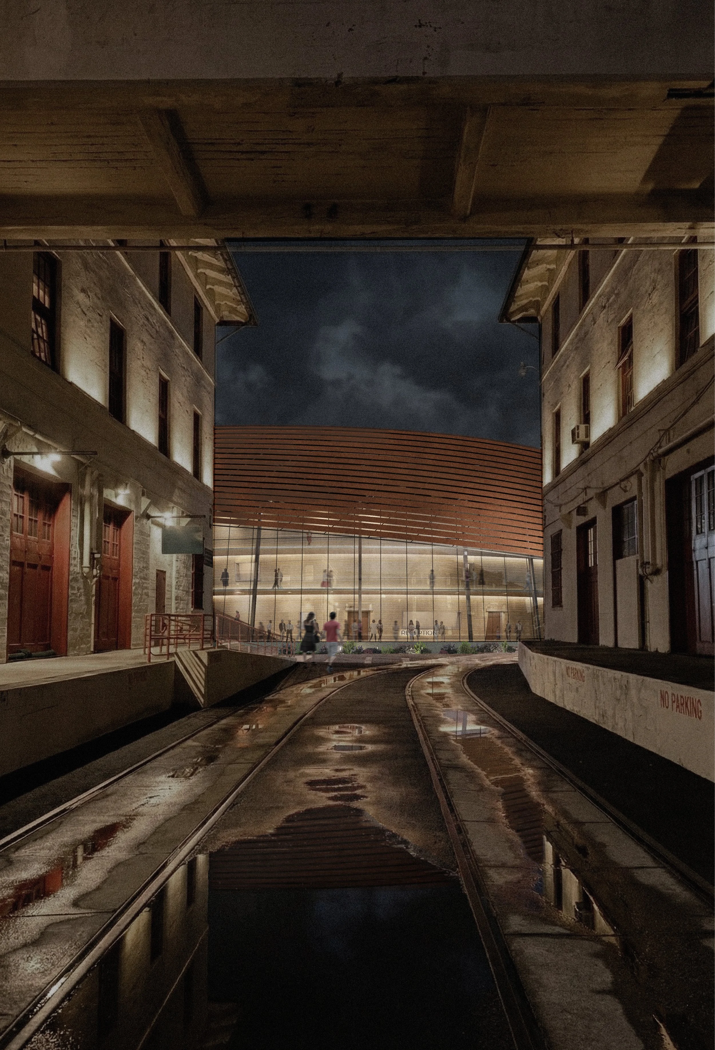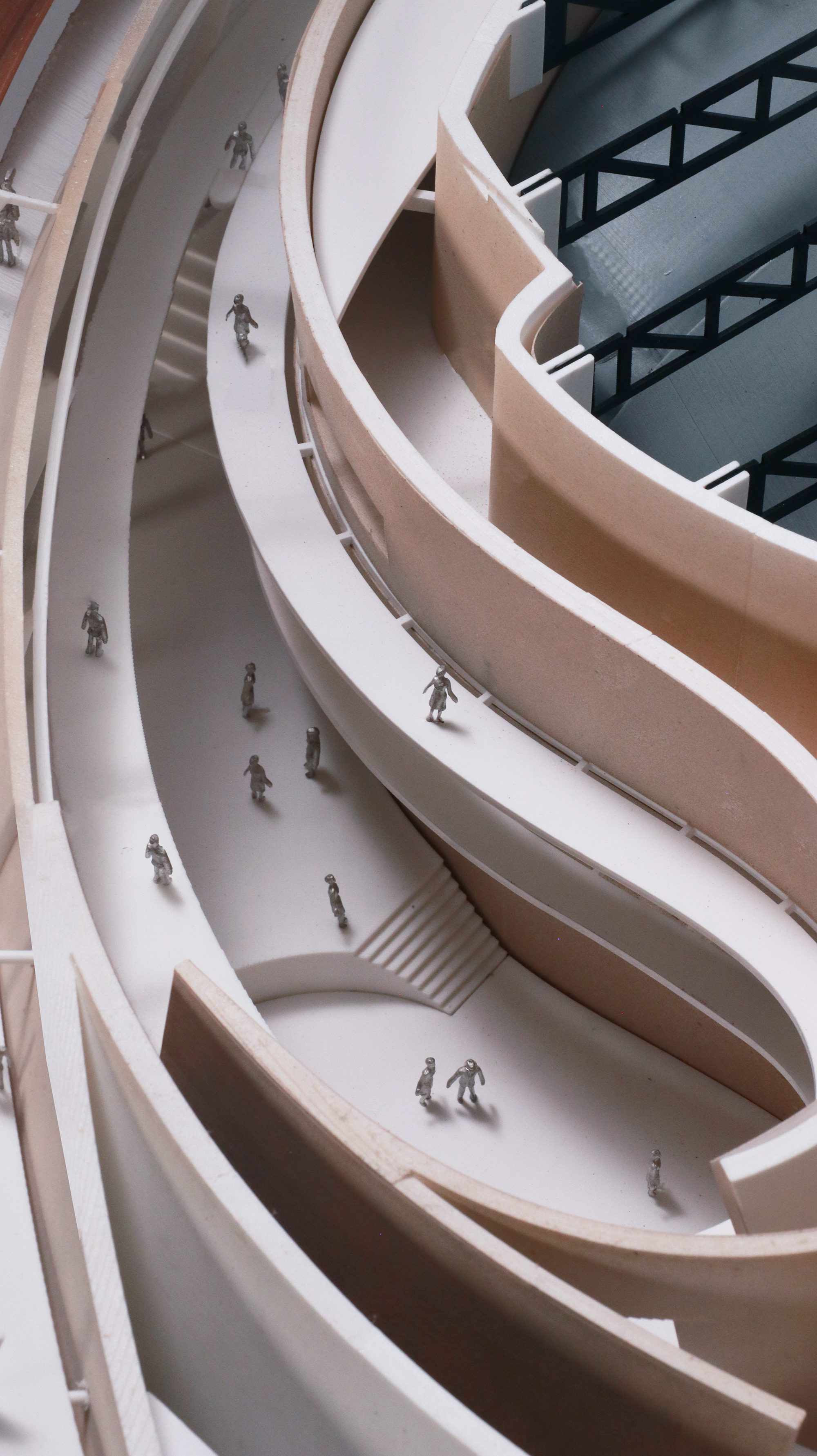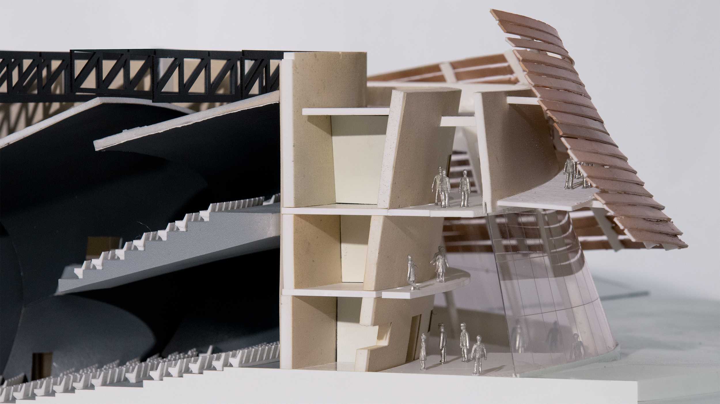 The house is a 1,000-seat theater with 700 seats at the orchestra level and 300 in the balcony, supported by a fly loft and orchestra pit that allow flexibility for dance, opera, drama, and music. While the overall building reads the curve vertically to choreograph circulation, the morphology of the theater rotates this logic ninety degrees, forming a sequence of portals that compress and release before opening toward the performance. Within the chamber, the seating steps and sweeps in a continuous curve, tightening sightlines and creating a shared focus that draws the audience toward the stage. The curved geometry enhances acoustic performance and intimacy, allowing the room to feel both collective and close. Flexible stage infrastructure and the orchestra pit enable multiple configurations, supporting a range of performance types while maintaining a cohesive spatial experience for both performers and audience