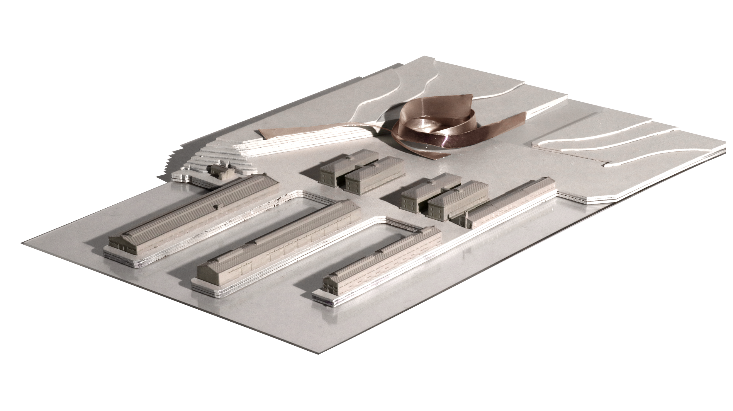 A clear spatial dichotomy exists between the rational grid of the landmark buildings and the curved retaining wall with its sinuous park paths. In response, the proposed urban strategy introduces a gentle slope from Lower Fort Mason to Bay Street, forming a grand entrance and establishing a stronger visual presence for the campus along Upper Fort Mason. The theater is positioned at the intersection of the primary cut and the existing curved retaining wall, set back and oriented toward the Lower Fort Mason entry. This node operates as a vortex, using the building itself as a system of pathways that draws people from the park to the theater and down into Lower Fort Mason, and vice versa.