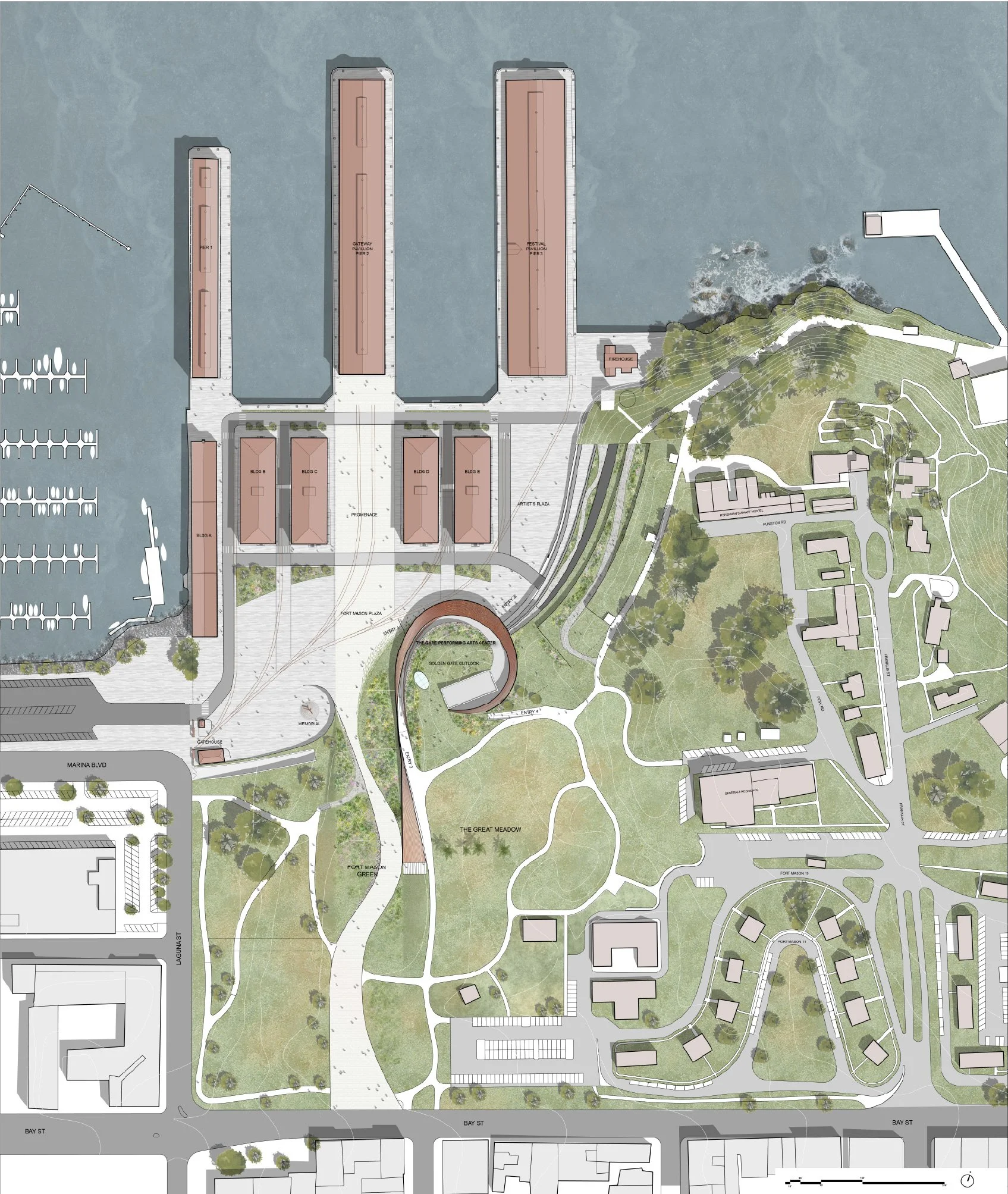 The site’s primary constraint is that Lower Fort Mason, where most public programs are located, is tucked beneath Upper Fort Mason, accessed through a narrow entry with little visual connection to the landmark buildings above. This disconnection is largely a result of the site’s topography, which has been repeatedly reshaped over time to accommodate changing military needs. Much of the ground plane is dominated by parking, creating narrow pinch points and limiting permeability.